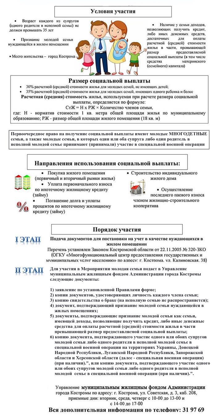 Вопросами реализации мероприятия по обеспечению жильем молодых семей федерального проекта «Содействие субъектам Российской Федерации в реализации полномочий по оказанию государственной поддержки гражданам в обеспечении жильем и оплате жилищно-коммунальных услуг» государственной программы Российской Федерации «Обеспечение доступным и комфортным жильем и коммунальными услугами граждан Российской Федерации» занимается Отдел учёта, приватизации жилых помещений и работы с недвижимостью Управления муниципальным жилищным фондом Администрации города Костромы.