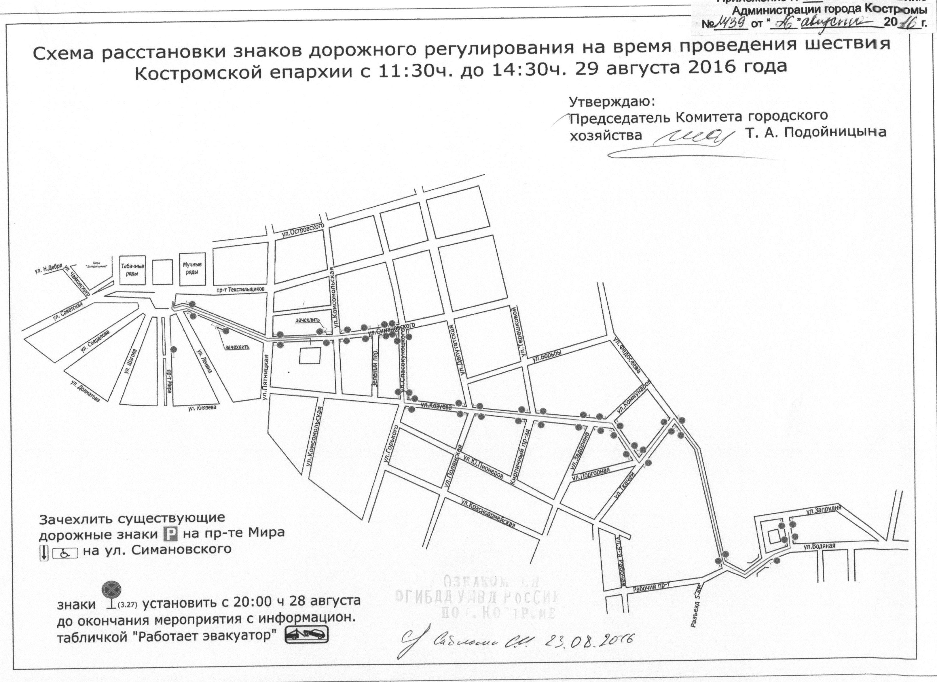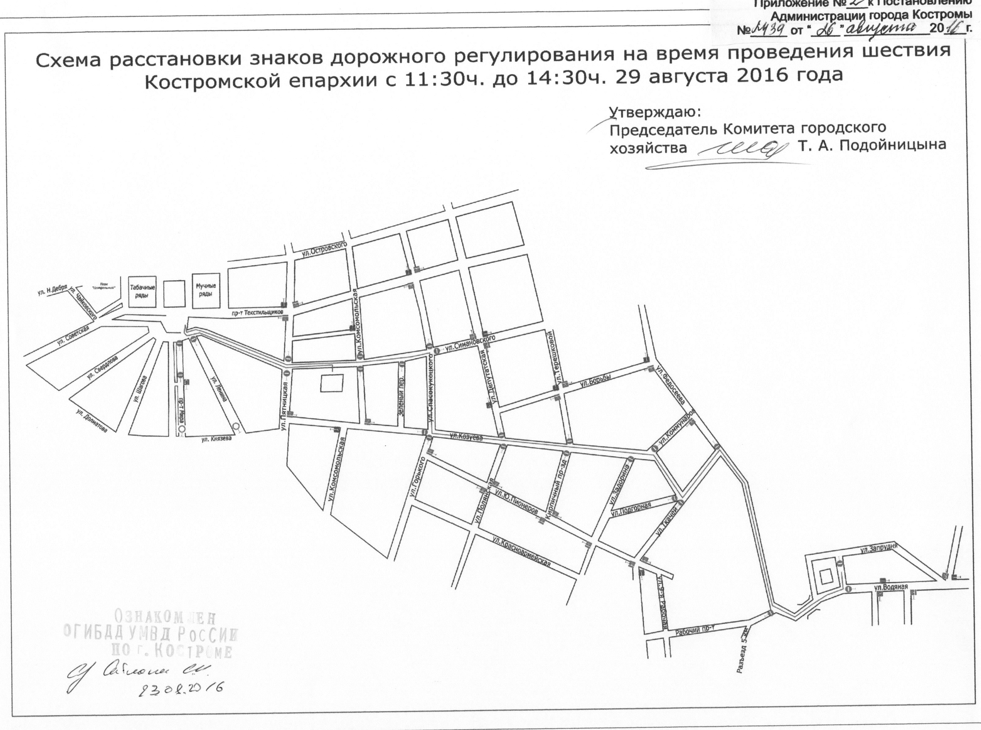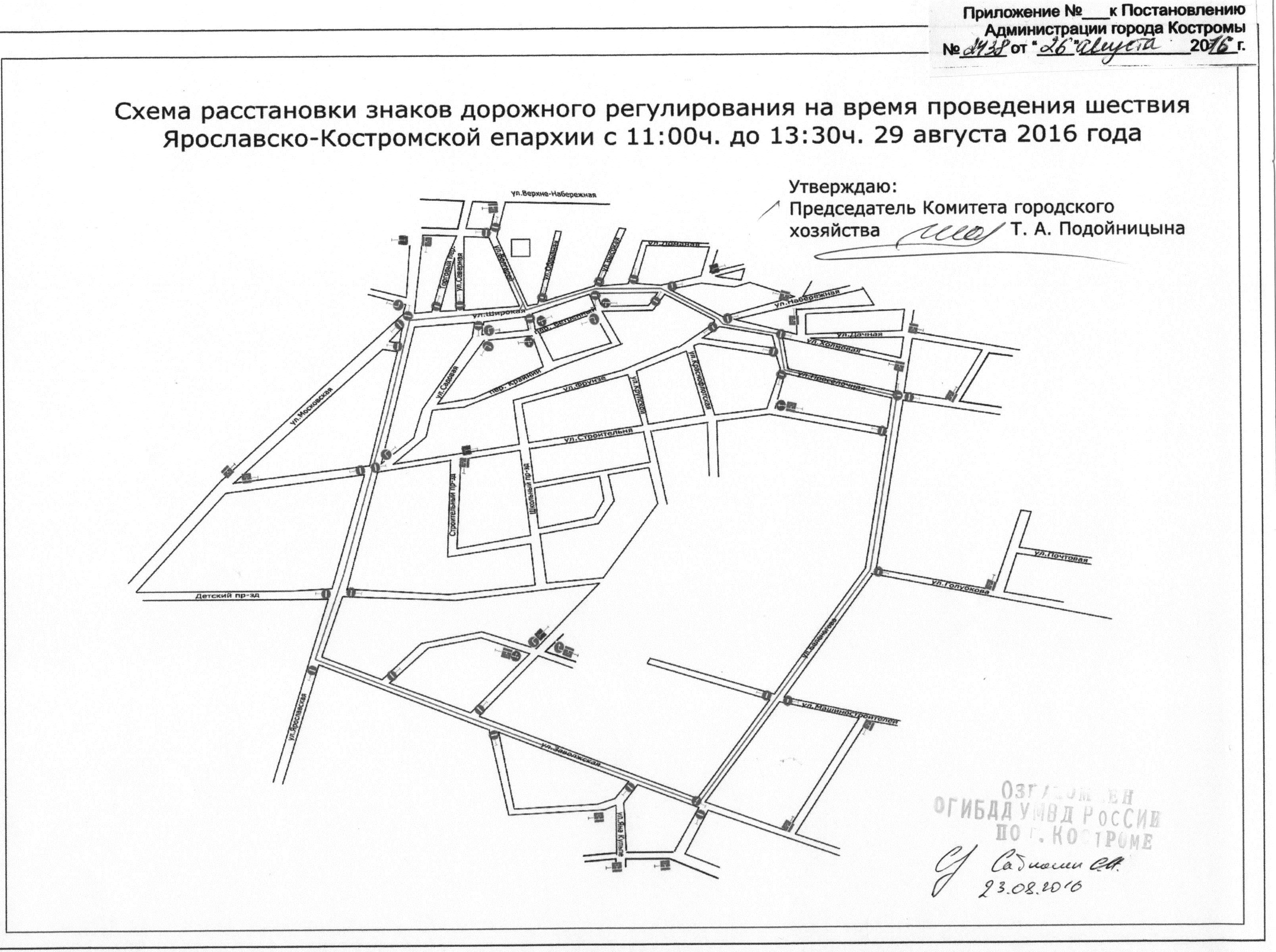 В связи с проведением мероприятий в рамках празднования дня Феодоровской иконы Божией Матери 29 августа будут внесены изменения в организацию движения общественного пассажирского транспорта и прекращено движение всех видов транспорта по маршруту следования торжественных шествий. Крестный ход, организованный религиозной организацией Костромской Епархии Русской Православной Церкви, пройдёт с 11:30 до 14:30 по следующему маршруту: улица Симановского (от дома № 1 по улице Спасокукоцкого) – улица Спасокукоцкого – улица Козуева – улица Ткачей – улица Коммунаров – улица Водяная – улица Запрудня (до дома № 2 по улице Запрудня). Крестный ход, организованный религиозной организацией Ярославско-Костромской епархии Русской православной Старообрядческой Церкви, пройдёт с 11:00 до 13:30 по следующему маршруту: улица Волгарей (от дома № 4 по улице Волгарей) – улица Широкая – улица Холмовая – улица Проселочная – улица Беленогова – улица Заволжская – улица Ярославская – улица Широкая – улица Волгарей (до дома № 4 по улице Волгарей). Схема 1 и Схема 2 расстановки знаков дорожного регулирования на время проведения шествия, организованного Костромской Епархией Русской Православной Церкви Схема расстановки знаков дорожного регулирования на время проведения шествия, организованного Ярославско-Костромской епархией Русской Православной Старообрядческой Церкви